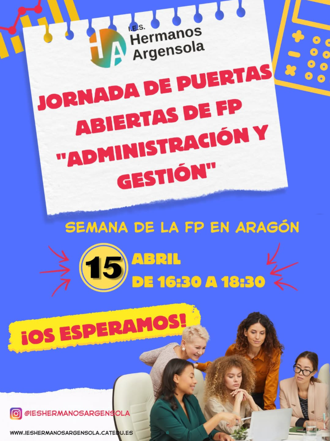 El miércoles 15 de abril, de 16:30 a 18:30 horas, os animamos a participar en las Jornada de Puertas Abiertas de los Ciclos Formativos de “Administración y Gestión”, organizada como parte de la Semana de la FP en Aragón. ¡Ven a descubrir todo lo que el IES Hermanos Argensola puede ofrecerte! 🎉